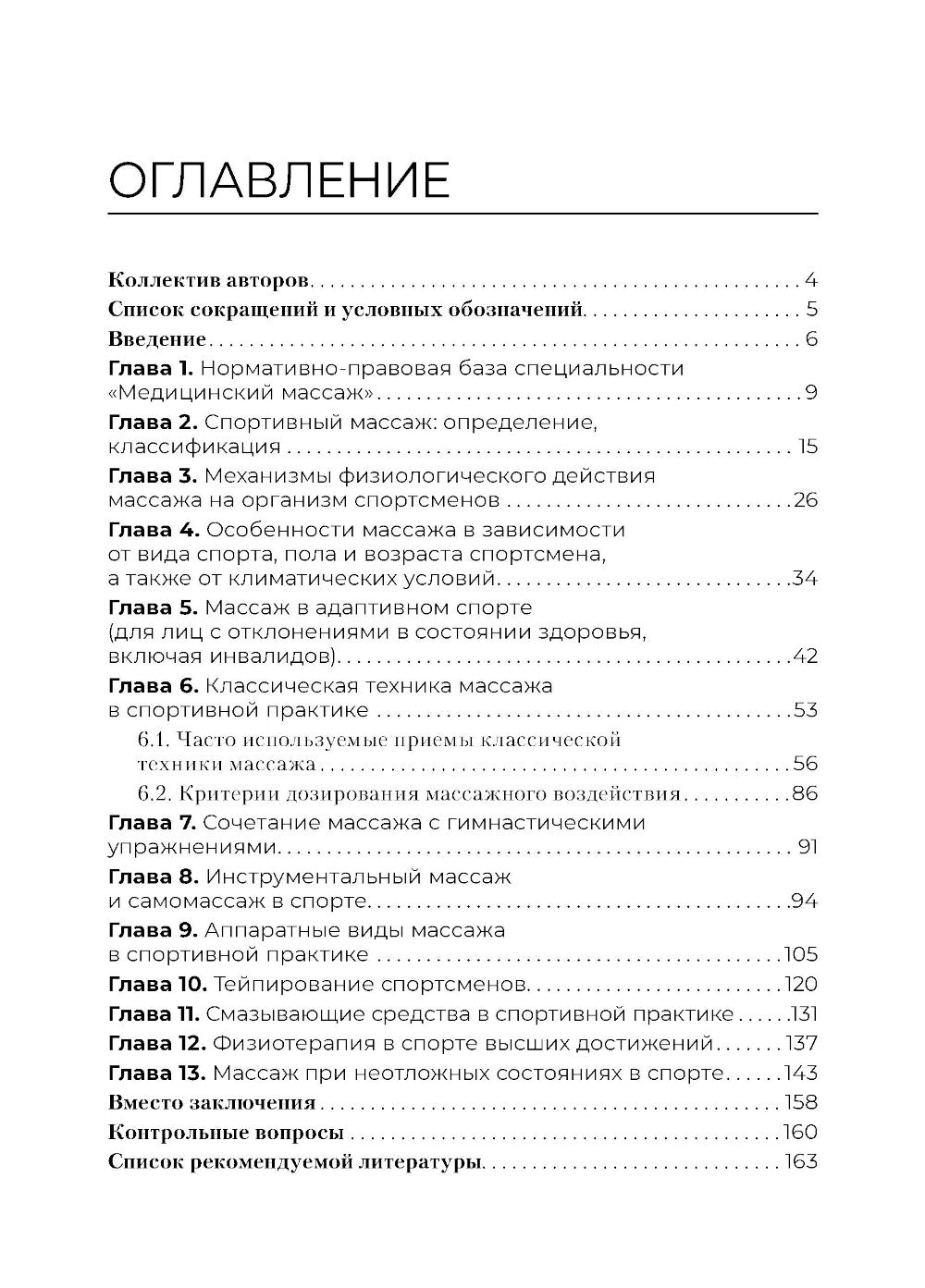 В учебном пособии подробно изложены особенности классической техники массажа, применяемой в спортивной практике, методики массажа в зависимости от вида спорта, пола и возраста спортсмена, а также климатических условий, которые в ходе тренировок и соревновательных мероприятий. Приведены методические особенности применения массажа в сочетании с терапевтическими гимнастиками, физиотерапевтическими процедурами, тейпированием, лекарственными препаратами для местного воздействия. Дано описание использования массажных манипуляций при неотложных состояниях в спорте. Издание подготовлено согласно федеральному государственному образовательному стандарту среднего профессионального образования по специальности 34.02.02 «Медицинский массаж (для обучения лиц с ограниченными возможностями здоровья по зрению)» и профессиональному стандарту «Специалист по медицинскому массажу». Учебное пособие адресовано непосредственно специалистам по массажу средней команды, а также специалистам по медицинскому массажу, медицинской помощи, врачам физической и реабилитационной медицины, остеопатам, мануальным терапевтам, рефлексотерапевтам, сестрам по лечению, инструкторам-методистам и инструкторам по лечебным физическим культурам, специалистам по физической реабилитации и, наконец, будет полезно всем специалистам, работающим в спортивной медицине.