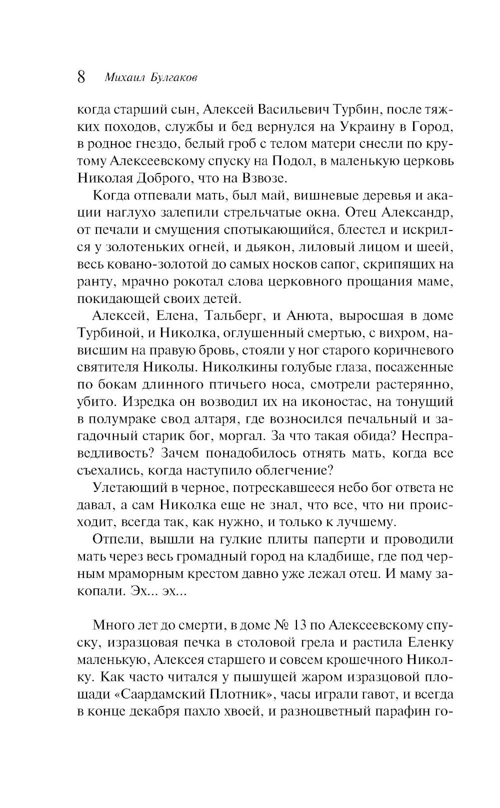 «Белая гвардия» — захватывающая семейная сага Михаила Булгакова, в которой автор частично изобразил историю собственной семьи, роман о социальной катастрофе, об исчезновении целого уклада жизни, которого больше никогда не будет. Любовь и предательство на фоне гражданской войны, вера и отчаяние, страх и безудержная отвага — все это Булгаков передал простыми и понятными сердцу каждым словами. Этот роман — «Война и мир» начала ХХ века, эквивалентный по замыслу шедевру Льва Толстого, пронзительного и лиричного.