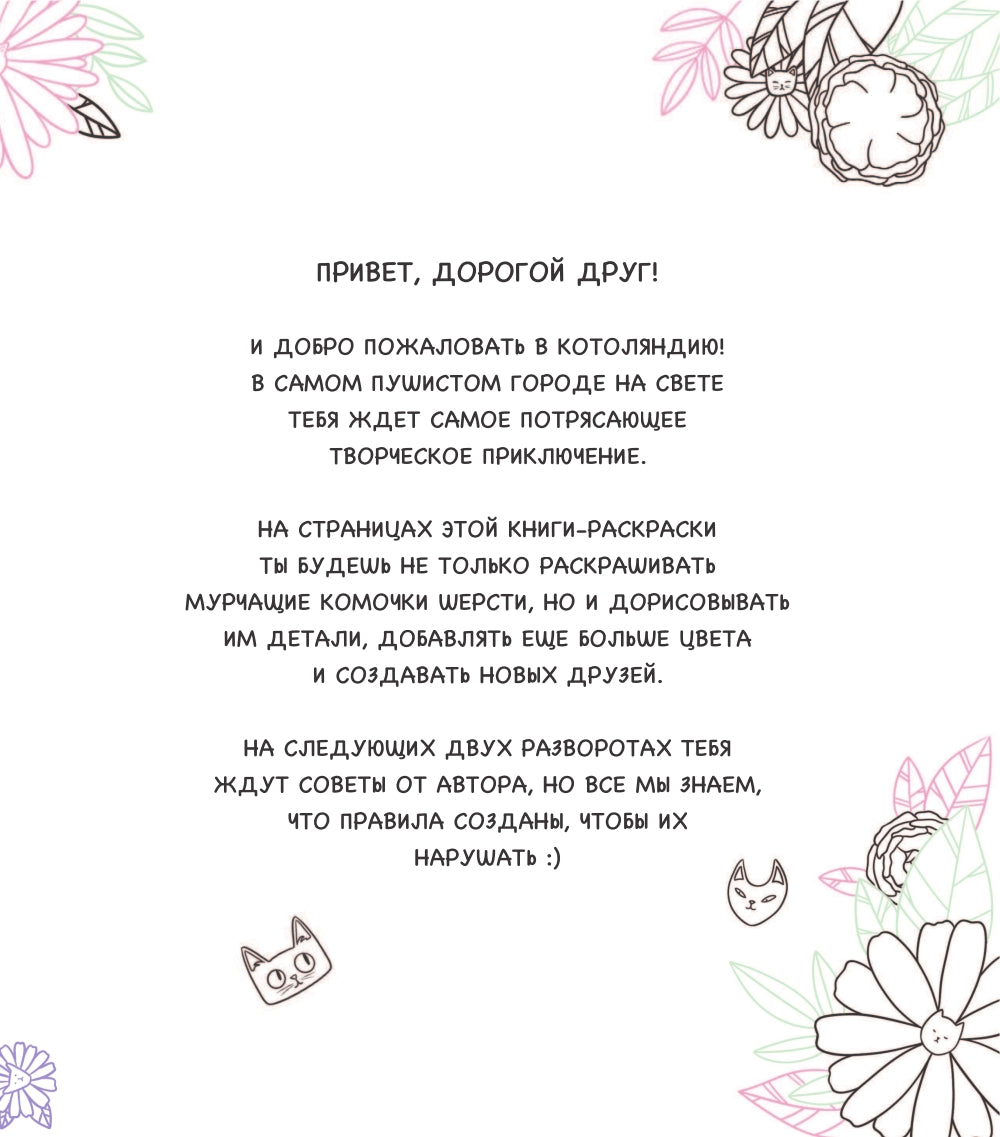 Добро пожаловать в самый пушистый город на планете! На страницах «Котоляндии» читателя ждет невероятное приключение по миру усатых и пушистых друзей. На ее страницах вас ждут иллюстрации самых разных котиков, интерактивные тематические задания, развороты для раскрашивания, а также заряд вдохновения на создание настоящих мурчащих красавцев и красавиц! Все иллюстрации выполнены в авторском стиле художницы RiAlbini. Не бойтесь экспериментировать, записывайте безумные цвета и просто творите! Добавьте цвета в мир Котоляндии уже сейчас, а в отзывах поделитесь своей получившейся вселенной.