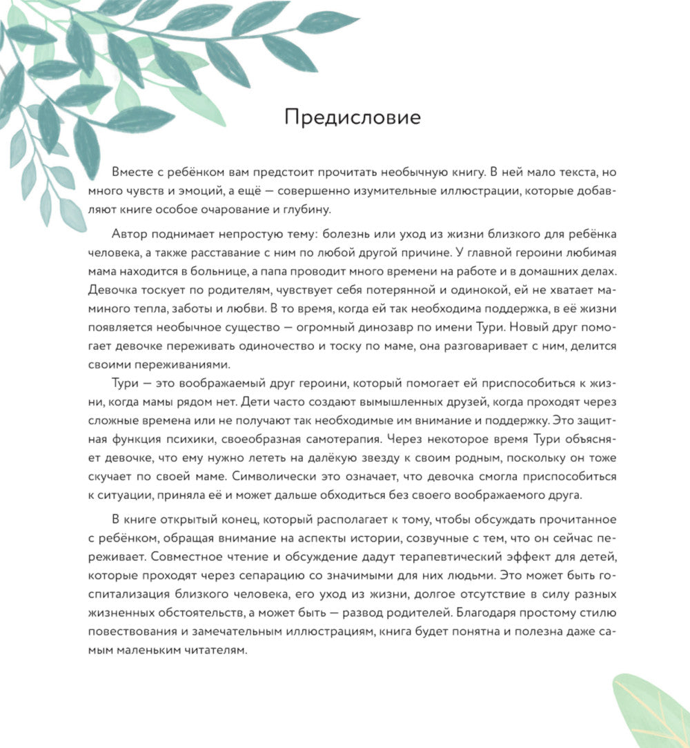 Терапевтическое чтение для детей и их родителей! Предисловие и вопросы для обсуждения от практикующего детского и семейного психолога Екатерины Кес. Книгу украшают нежные иллюстрации корейской художницы, обладательницы премии Тайваньской открытой книжной премии. Главная героиня переживает болезнь мамы. Всё, что она может — прочитать у больничной койки свою любимую книгу о динозаврах. Ей тяжело и одиноко, но однажды в ее жизни появляется Тури. Он — большой говорящий динозавр. С ним весело играть, и можно поговорить о важном и сокровенном. Но что, если Тури откажется от своей подруги? Совместное чтение терапевтических сказок об исцеляющей силе дружбы помогает родителям научить своих детей справляться с грустными эмоциями. Предисловие и вопросы для обсуждения от детского психолога показывают, как вовлечённо слушать, на что обращать внимание и как грамотно направлять ребёнка в его сложных обстоятельствах. История о Тури показывает поддерживающую и важную роль воображаемого друга и позволяет родителям вести переговоры с детьми в состоянии печали, одиночества и растерянности.