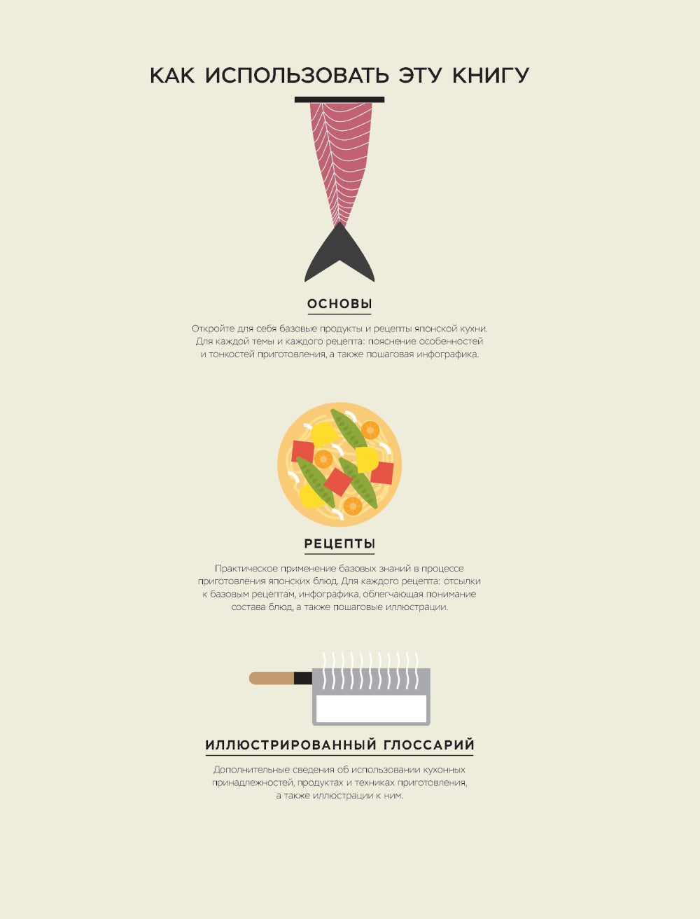 Японская кухня вошла в нашу жизнь гораздо быстрее, чем китайская и корейская, потому что ее основные блюда — суши и роллы — пришлись по вкусу гораздо большему вниманию людей из-за простых подач, легкости порций, приемлемости специй. Приготовление их дома всегда казалось странным для любителей готовить. Но любая задача становится решаемой, если есть хороший помощник. Таким помощником является прекрасное издание с подробно разработанной структурной теорией и практикой, четкими схемами и пошаговыми фотографиями процесса подготовки. Книга начинается с основ японской кулинарии — продукты: риса и лапши, соевого соуса и тофу, шиитаке и мисо; техника разделки; кляры и соусы. На этой основе приготовление основных блюд японской кухни — супов, жареных и тушеных блюд и блюд во фритюре, а также сладостей — скорее вызывает удовольствие и размышления, чем озабоченность и беспокойство. Следуйте шаг за шагом по страницам книги и будьте вознаграждены за свою смелость!