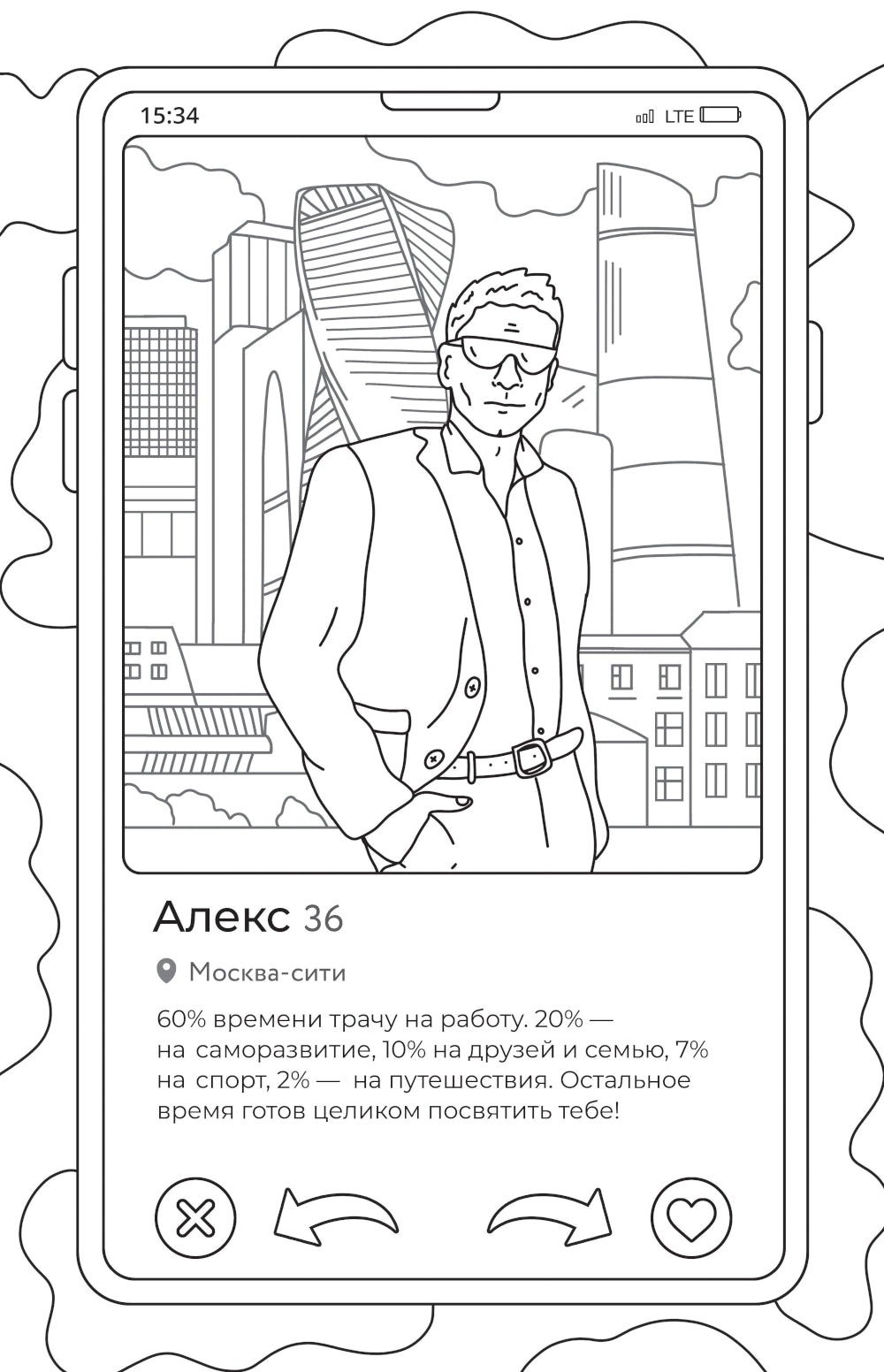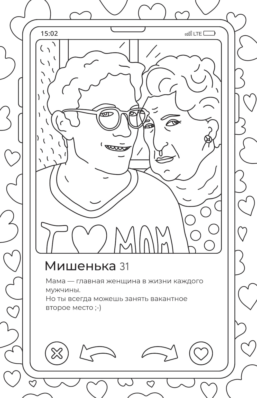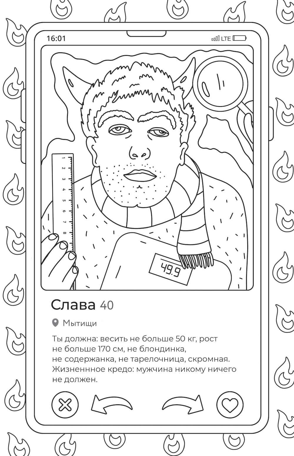 Свайп вправо? Или все же влево? Эта раскраска — настоящий каталог персонажей, которых можно встретить на просторах дейтинговых приложений. На ее страницах вы найдете и сына маминой подруги, и того самого решалу, а может быть, даже своего бывшего. Соберите скорее подругу, доставьте любимые художественные материалы и проведите вечер в отличной компании. И все же кого ты выберешь: богача из Москва-Сити или «ровного пацана» с района?