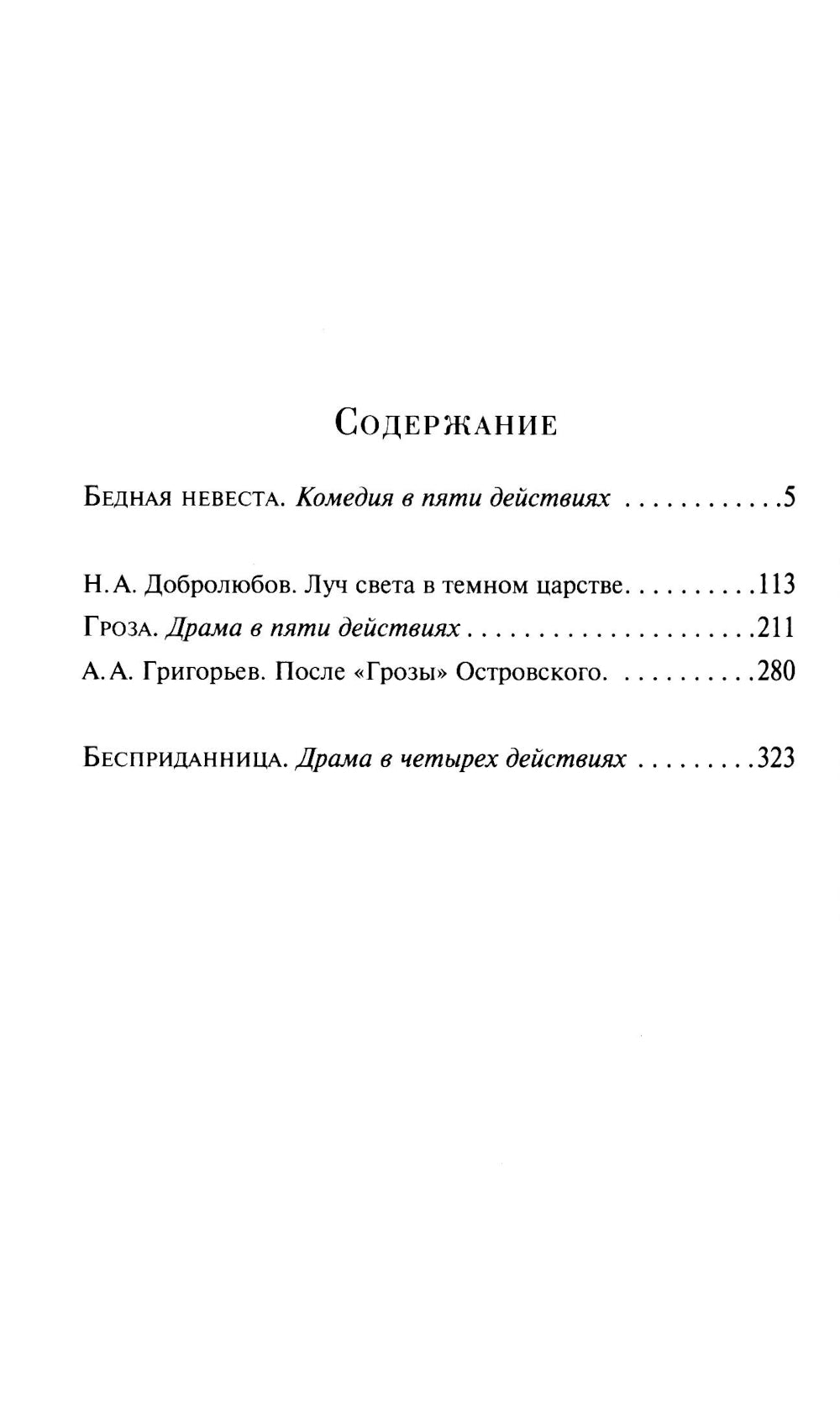 Пьесы Александра Николаевича Островского (1823–1886) — это шедевры русской драматургии. История вынужденного брака по расчету в «Бедной невесте», несчастливого замужества и отчаяния в «Грозе», бесплодных поисков настоящей любви в «Бесприданнице»... Произведения отражают нравы и социальные противоречия русской жизни XIX века, раскрывают темы положения женщин в обществе. Пьеса «Гроза» сопровождаются определёнными статьями: «Луч света в тёмном царстве» Н. А. Добролюбова, «После «Грозы» А. А. Григорьева.