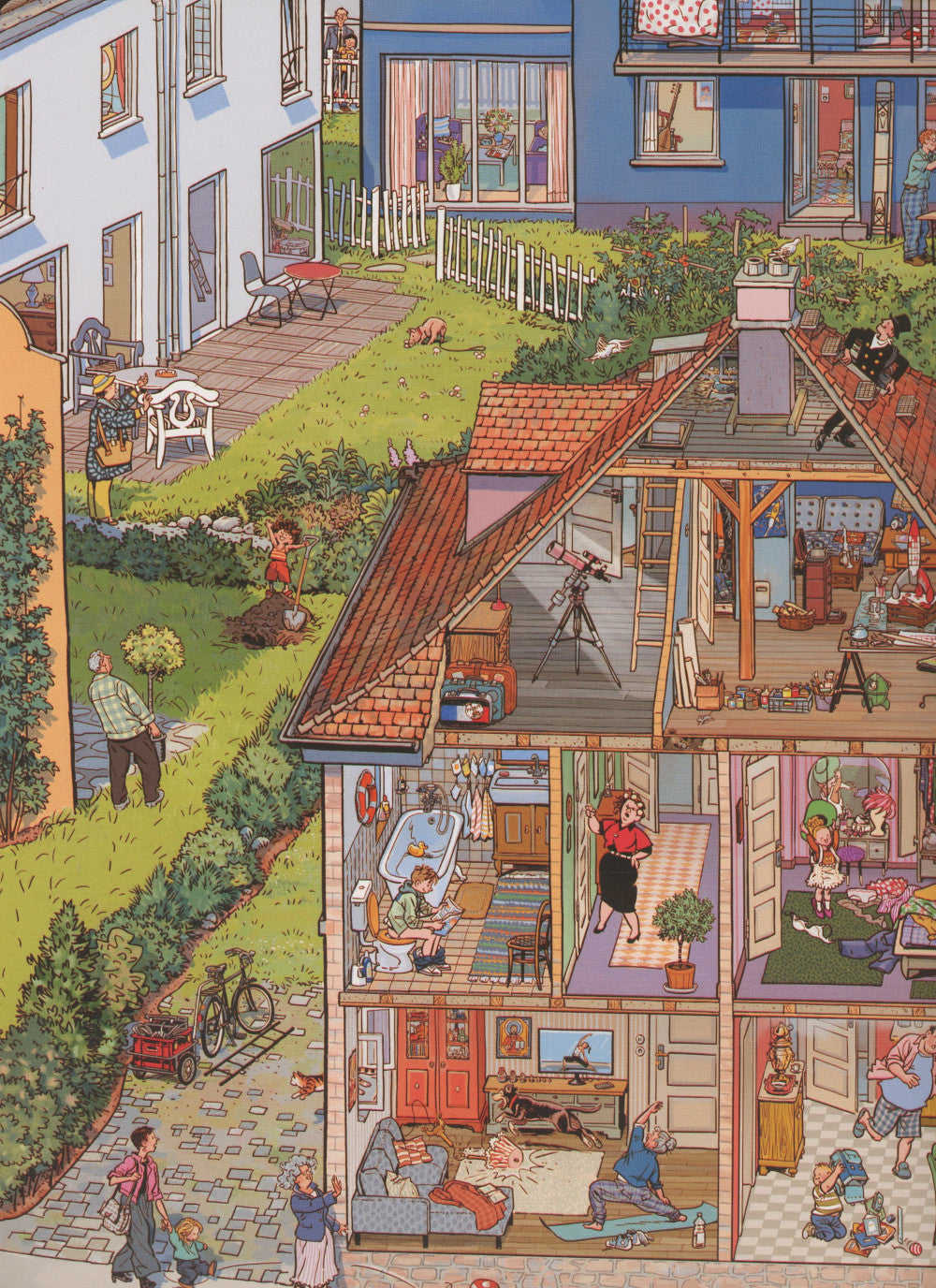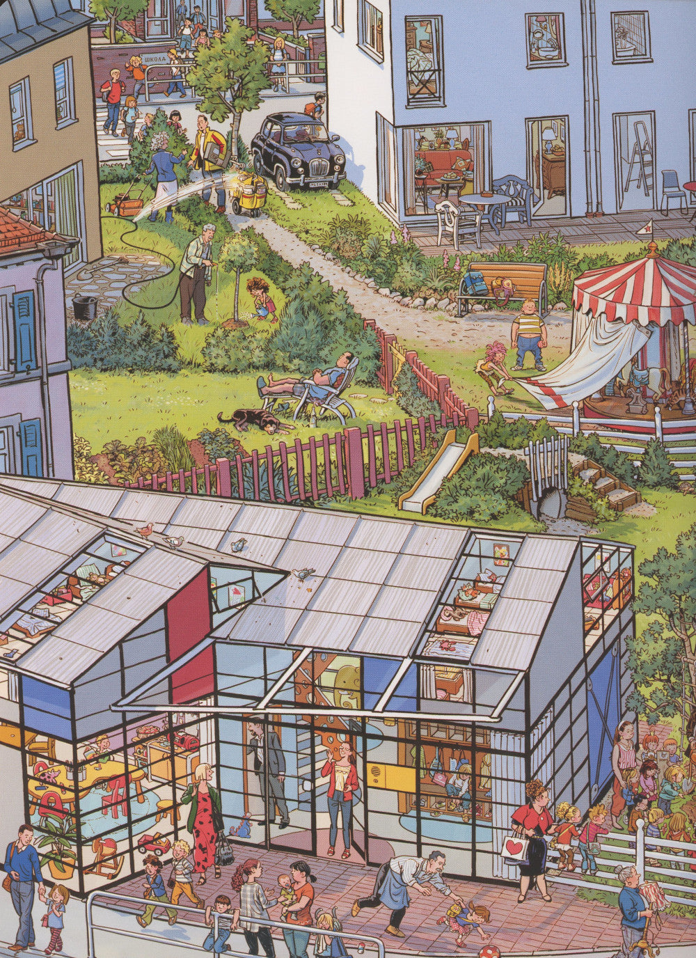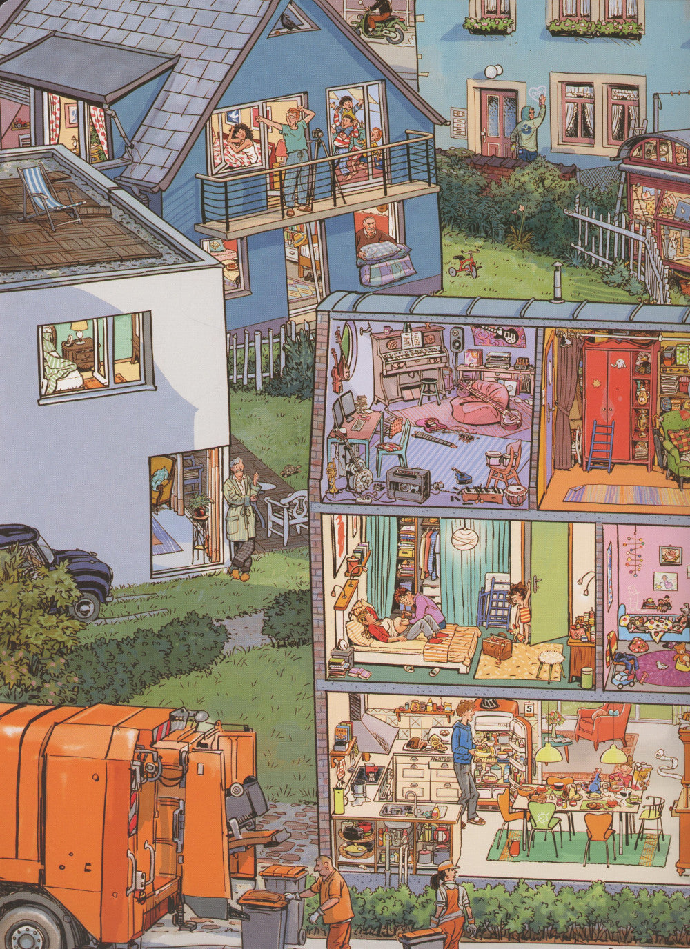 В самом обычном городе на самой обычной улице проживают самые обычные люди: кто-то в отдельной квартире, кто-то в собственном доме, кто-то в строительном вагончике. Книга дает прекрасную возможность побывать в гостях у всех героев, познакомиться с тем, кто живет, и как проводить свой обычный день. Вот молодая семья, в которой в ближайшее время будет вестись пополнение; а вот новоселы перетаскивают коробку из грузовичка в свою новую квартиру; у кого-то сегодня семейный праздник, а у кого-то хлопоты по хозяйству. «История в картинках» - это настоящее немое кино. Рассматривая книгу, дети научатся видеть и подмечать детали, прослеживать логические связи между событиями, самостоятельно составлять рассказ по картинкам. В книге столько сюжетных линий, что невозможно отследить их все за один раз. Они переплетаются, пересекаются постоянно, как в настоящем кино – и как в настоящей жизни!