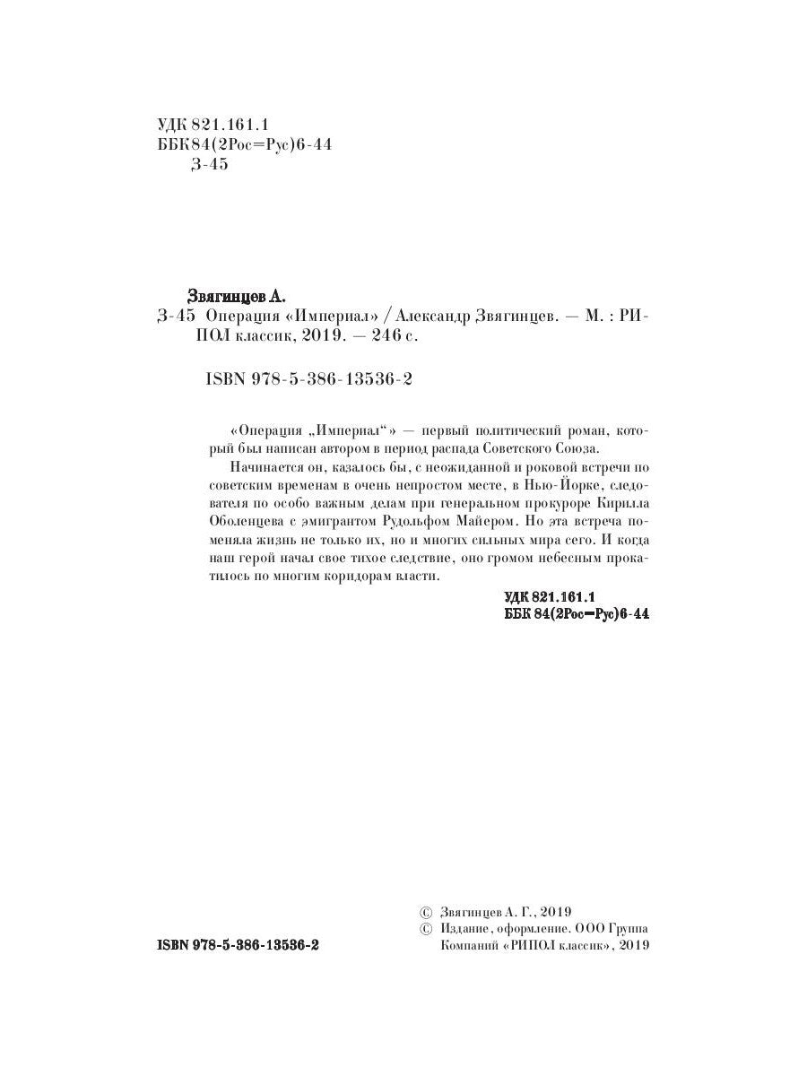 «Операция «Империал»» — первый политический роман, который был написан автором в период существования Советского Союза. Он начинается, казалось бы, с неожиданной и роковой встречи в советские времена в очень фундаментальном месте, в Нью-Йорке, следователя по особо важным делам генерального прокурора Кириллы Оболенцева с эмигрантом Рудольфом Майером. Но эта встреча поменяла жизнь не только их, но и многих сильных мира сего. И когда наш герой начал свое тихое представление, оно громом небесным прокатилось по многим коридорам власти.