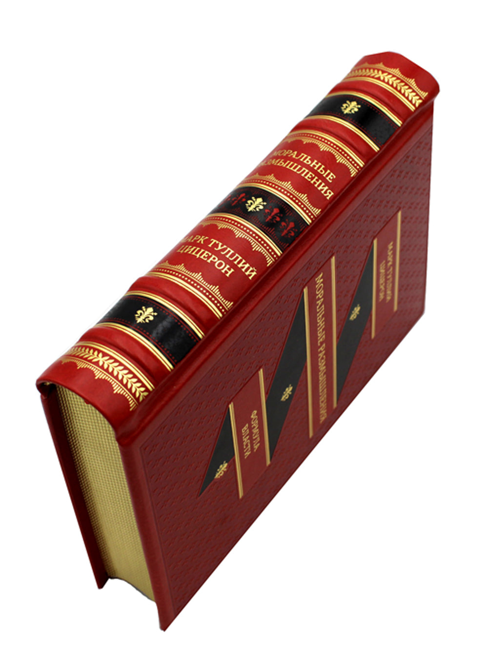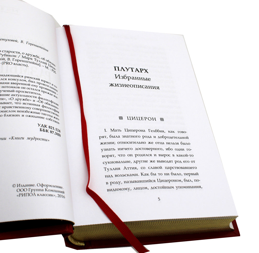Марк Туллий Цицерон — выдающийся римский юрист и государственный деятель, избирался консулом, был приглашен в сенат отцом отечества, воинами, верной ему провинцией-императором. Однако в памяти потомков он остался прежде всего как замечательный оратор и ученый-просветитель. В книгах собраны не потерявшие актуальности философские трактаты Цицерона: «О старости», «О дружбе» и «Обязательства по оказанию помощи». Автор убедительно доказывает, что истинная философия подразумевает дружбу, содействует нравственному совершенствованию, а также исполняет новый смысл неизбежных тягот жизни: старость, боль утрат, постоянство близких и ожидание собственной кончины. Переплёт ручной работы из натуральной кожи. Форзац из дизайнерской бумаги. 4 бинта на корешке, ручная обработка. Обрез блока торшонированное золото. Тиснение блинтовое, золотой и цветной фольгой. Каптал из натуральной кожи. Ляссе.
