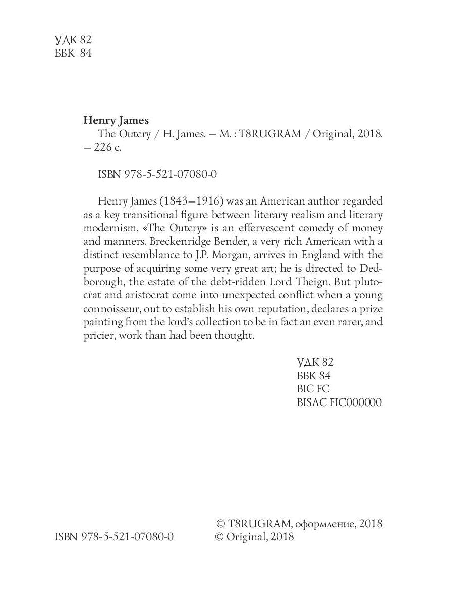 Генри Джеймс (1843—1916) — американский писатель, считающийся ключевой фигурой на стыке литературного реализма и литературного модернизма. «Вопль» — искромётная комедия о деньгах и нравах. Брекенридж Бендер, очень богатый американец, отчётливо напоминающий Дж. П. Моргана, приезжает в Англию с целью приобрести выдающиеся произведения искусства; его направляют в Дедборо, поместье обременённого долгами лорда Тейна. Но плутократ и аристократ неожиданно сталкиваются, когда молодой ценитель, стремясь упрочить свою репутацию, заявляет, что ценная картина из коллекции лорда на самом деле ещё более редкая и дорогая, чем предполагалось.