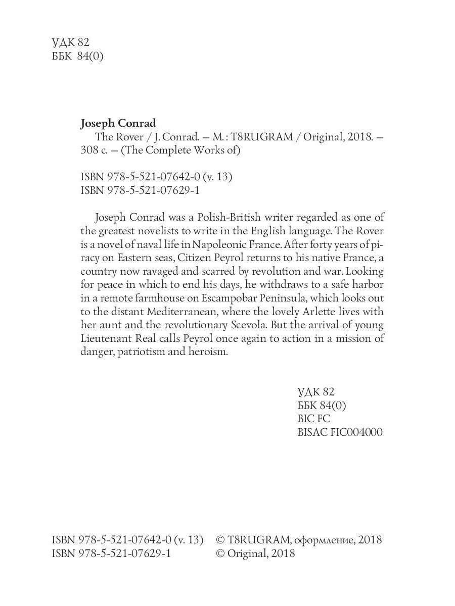 Джозеф Конрад – польско-британский писатель, считающийся одним из величайших англоязычных романистов. «Ровер» – роман о жизни моряков наполеоновской Франции. После сорока лет пиратства в восточных морях гражданин Пейроль возвращается в родную Францию, страну, опустошенную и израненную революцией и войной. В поисках мира, где он мог бы провести остаток своих дней, он уединяется в тихой гавани, в уединённом фермерском доме на полуострове Эскампобар, откуда открывается вид на далёкие воды Средиземного моря. Там живёт очаровательная Арлетт со своей тётей и революционером Сцеволой. Но прибытие молодого лейтенанта Реаля вновь призывает Пейроля к действию – миссии, полной опасностей, патриотизма и героизма.