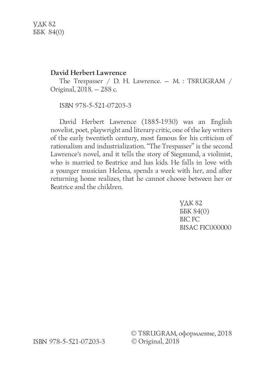 Дэвид Герберт Лоуренс (1885–1930) — английский писатель, поэт, драматург и литературный критик, один из ключевых писателей начала XX века, наиболее известный своей критикой рационализма и индустриализации. «Нарушитель» — второй роман Лоуренса, рассказывающий историю Зигмунда, скрипача, женатого на Беатрис и имеющего детей. Он влюбляется в более молодую музыкантшу Хелену, проводит с ней неделю и, вернувшись домой, понимает, что не может выбрать между ней и Беатрис с детьми.